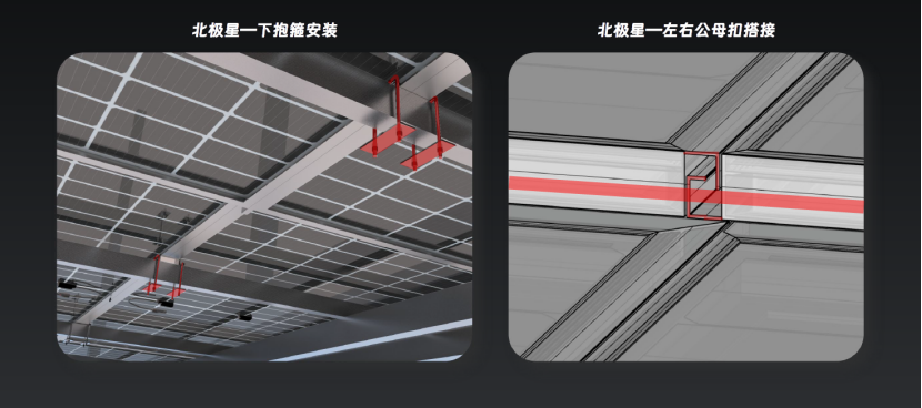针对阳光棚场景兼容下安装的方案,施工方可以站在钢结构下方进行产品的安装。安装配件也十分简单,利用抱箍和两种压件将产品固定在钢结构的檩条上即可。
