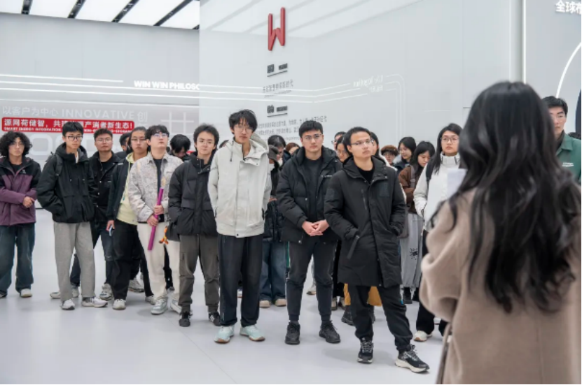 在固德威团队的陪同下,师生们系统了解了光伏逆变、储能、光电建材与智慧能源管理的技术体系。从智慧能源大厦的外立面到车棚、光伏花园,大家实地观察光电建材的构造、排布方式,以及防水、通风散热等关键技术策略。展厅内的系统化展示与建筑本体的真实呈现相互印证,让同学们对光伏建筑一体化从设计图纸到工程实践的全过程,有了更直观立体的认知。